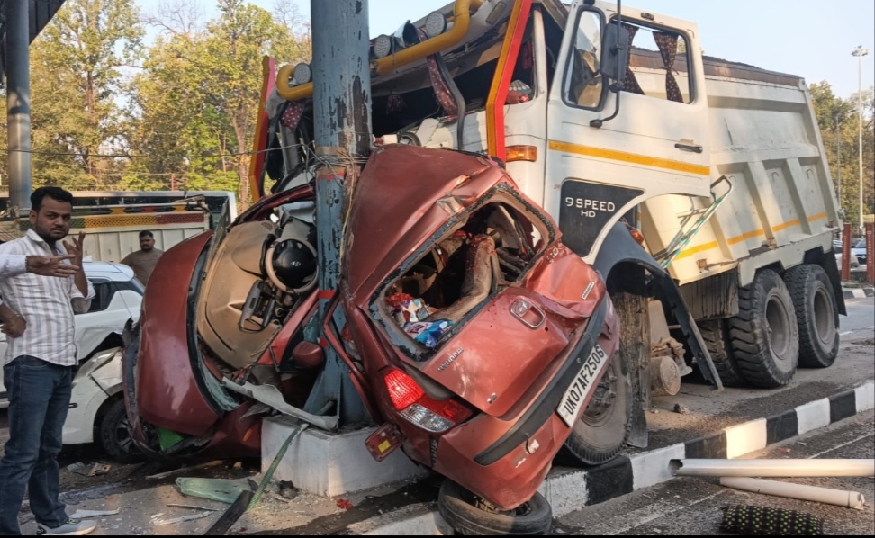 एक गाड़ी अभी भी ट्रक के नीचे दबी है कई लोगो के हताहत होने की खबर।
