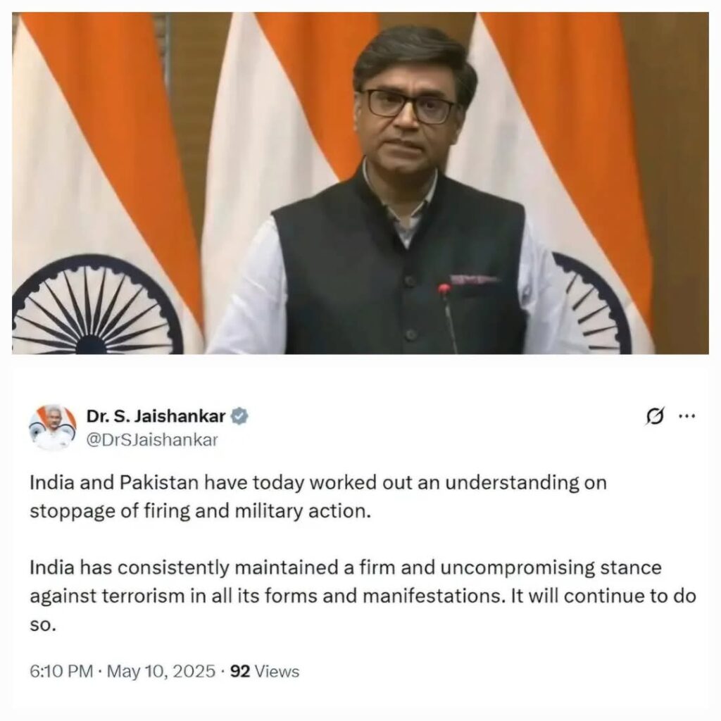 भारत-पाकिस्तान के बीच संघर्ष विराम की पुष्टि करते हुए विदेश मंत्री एस जयशंकर ने एक्स पर लिखा कि भारत और पाकिस्तान के बीच आज गोलीबारी और सैन्य कार्रवाई रोकने पर सहमति बनी है। भारत ने आतंकवाद के सभी रूपों और अभिव्यक्तियों के खिलाफ लगातार दृढ़ और अडिग रुख अपनाया है। वह ऐसा करना जारी रखेगा।